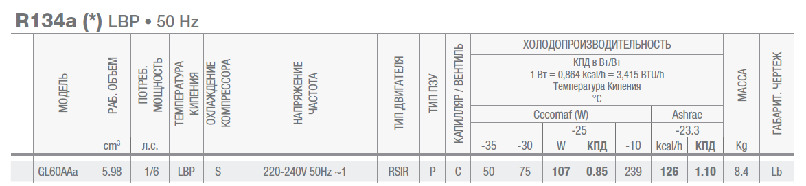 • Хладопроизводительность: 107 Wt (-25°/+55°С) (CECOMAF), 126 kcal/h (-23,3°/+55°С) (ASHRAE)