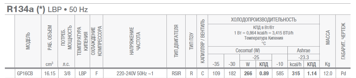 • Хладопроизводительность: 266 Wt (-25°/+55°С) (CECOMAF), 315 kcal/h (-23,3°/+55°С) (ASHRAE)