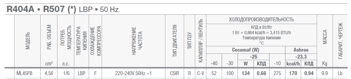 • Хладопроизводительность: 134 Wt (-25°/+55°С) (CECOMAF), 170 kcal/h (-23,3°/+55°С) (ASHRAE)