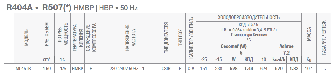 • Хладопроизводительность: 528 Wt (+5°/+55°С) (CECOMAF), 570 kcal/h (+7,2°/+55°С) (ASHRAE)