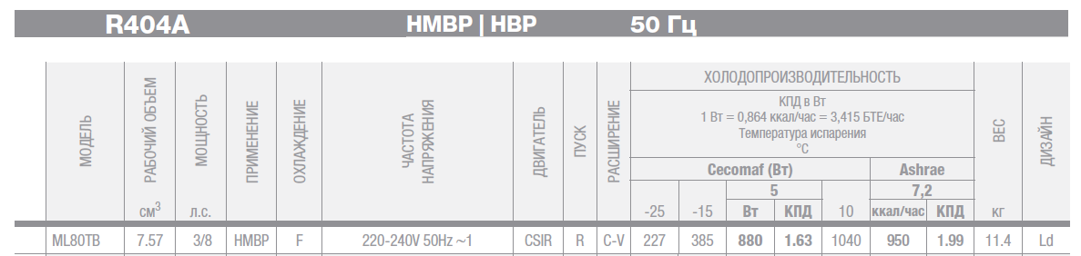 • Хладопроизводительность: 880 Wt (+5°/+55°С) (CECOMAF), 950 kcal/h (+7,2°/+55°С) (ASHRAE)