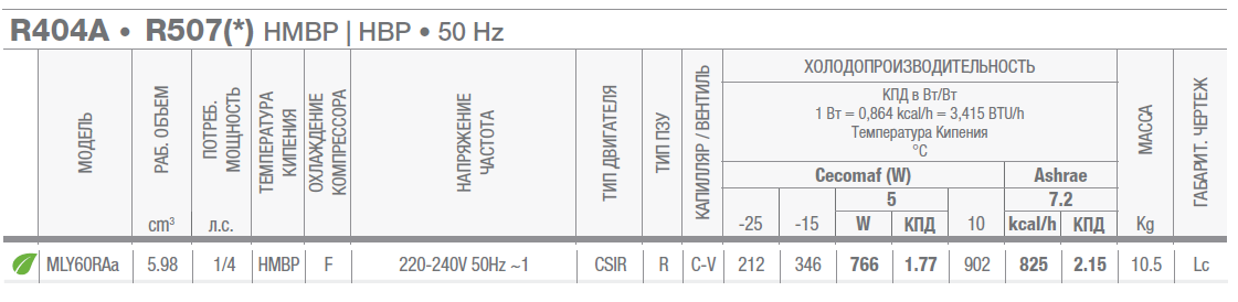 • Хладопроизводительность:527 Wt (-5°/+55°С) (CECOMAF), 429 Wt (-10°/+55°С) (CECOMAF), 700 kcal/h (+7,2°/+55°С) (ASHRAE)