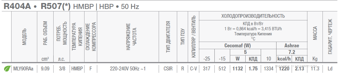 • Хладопроизводительность:779 Wt (-5°/+55°С) (CECOMAF), 634 Wt (-10°/+55°С) (CECOMAF), 1220 kcal/h (+7,2°/+55°С) (ASHRAE)