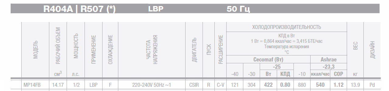 • Хладопроизводительность: 422 Wt (-25°/+55°С) (CECOMAF), 540 kcal/h (-23,3°/+55°С) (ASHRAE)