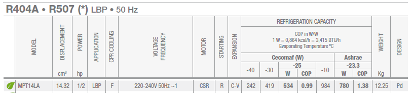 • Хладопроизводительность: 534 Wt (-25°/+55°С) (CECOMAF), 670 kcal/h (-23,3°/+55°С) (ASHRAE)