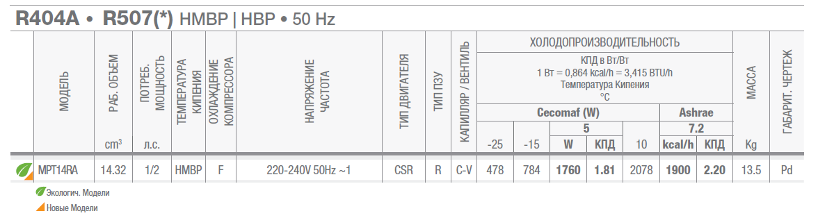• Хладопроизводительность: 1208 Wt (-5°/+55°С) (CECOMAF), 1760 Wt (+5°/+55°С) (CECOMAF), 1900 kcal/h (+7,2°/+55°С) (ASHRAE)