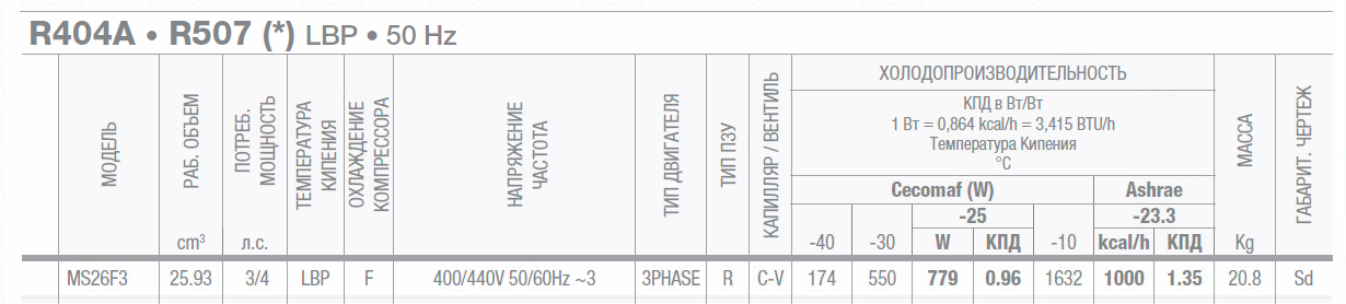 • Хладопроизводительность: 779 Wt (-25°/+55°С) (CECOMAF), 1000 kcal/h (-23,3°/+55°С) (ASHRAE)