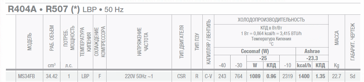 • Хладопроизводительность: 1089 Wt (-25°/+55°С) (CECOMAF), 1400 kcal/h (-23,3°/+55°С) (ASHRAE)