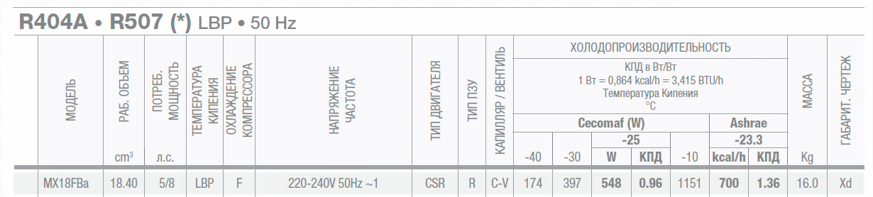 • Хладопроизводительность: 548 Wt (-25°/+55°С) (CECOMAF), 700 kcal/h (-23,3°/+55°С) (ASHRAE)