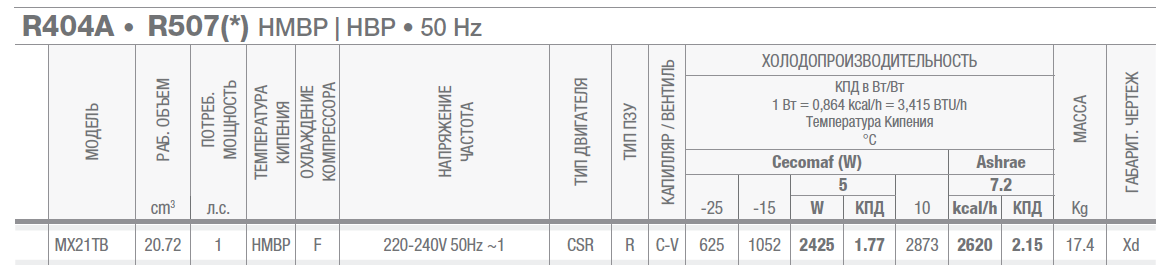 • Хладопроизводительность: 1323 Wt (-10°/+55°С) (CECOMAF), 1643 Wt (-5°/+55°С) (CECOMAF), 2620 kcal/h (+7,2°/+55°С) (ASHRAE)