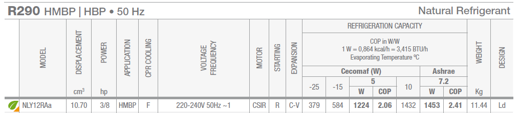 • Хладопроизводительность: 866 Wt (-5°/+55°С) (CECOMAF), 715 Wt (-10/+55°С) (CECOMAF)