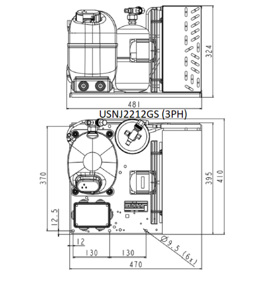Холодильний агрегат відкритого типу на 1.48 кВт при /Ткип -25°С, та Тн.с. +32°С/ USNJ2212GS (3 PHASE) EMBRACO, призначений для роботи в діапазоні -35...-10°С на фреоні R404a/R507c/R449/R452A.