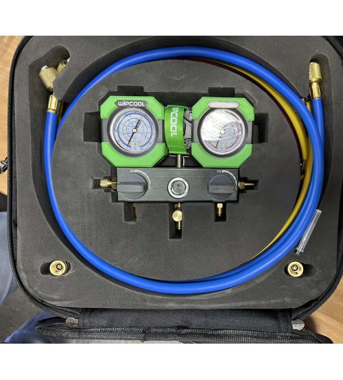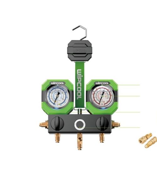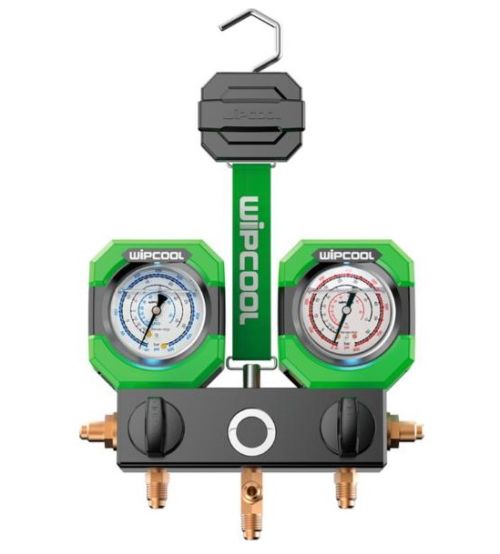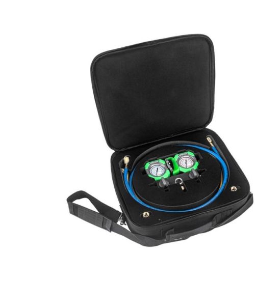 2-х вентильний колектор для R22 / R410A / R32 Оглядове скло LED підсвітка + USB кабель для зарядки Зручний тримач з гачком В комплекті: шланги 3х150 см, 2 адаптера 5/16"x1/4", кейс