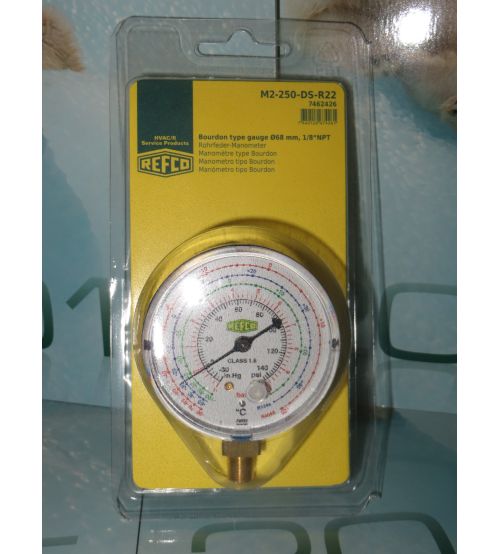 Манометр низкого давления (LP) для R-22, R-134A, R-404A класса 1.6 имеет наружный диаметр 68 мм, 2 3/4", штуцер внизу с резьбой 1/8" NPT и регулировочный винт установки нуля через стекло при помощи отвертки.