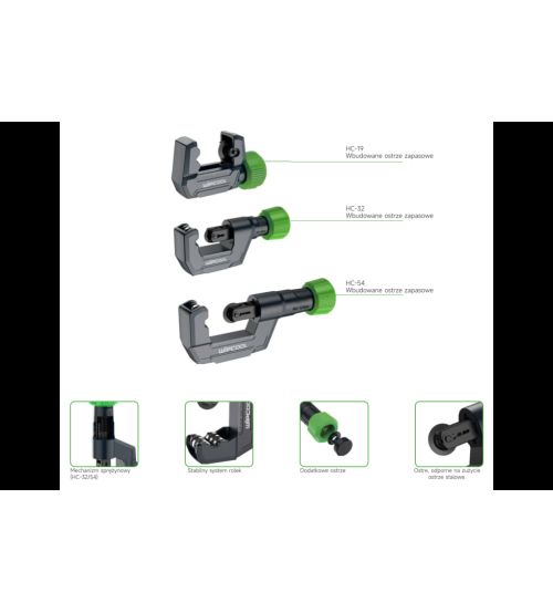 Конструкція пружини запобігає здавленню м'яких трубок. Леза, виготовлені зі зносостійкої сталі, забезпечують довговічність і надійність використання.Ролики та лезо оснащені кульковими підшипниками для більш плавної роботи.Стабільна роликова система стеження запобігає прорізанню труби. Додатково 1 змінне лезо в ручці труборіза.