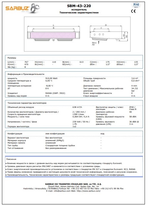 • При tc=-8°C, DT1=8K, R404A 910 Вт   (SC2)