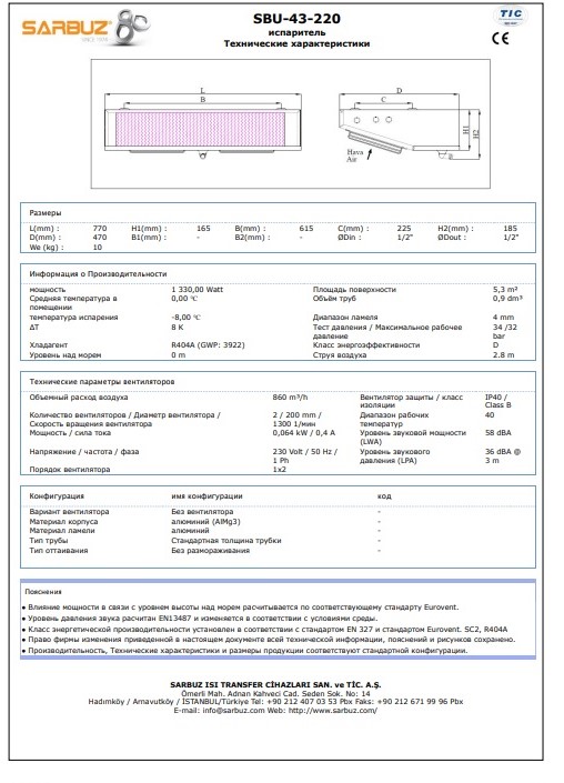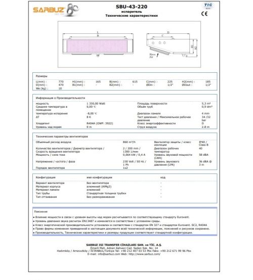 • При tc=-8°C, DT1=8K, R404A 1330 Вт   (SC2)