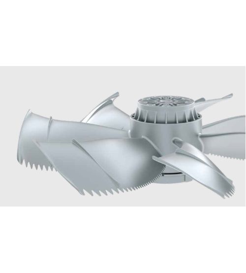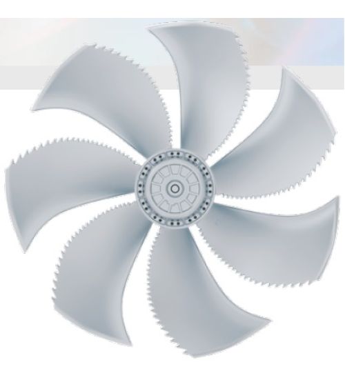 Рабочее колесо с 7 лопатками серповидной аэродинамической формы, литые под давлением из алюминия, разработаны с использованием бионических открытий, размер 250 - 800 мм, расход воздуха до 28.000 м³/ч. (без воздуховодов).