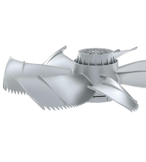 Рабочее колесо с 7 лопатками серповидной аэродинамической формы, литые под давлением из алюминия, разработаны с использованием бионических открытий, размер 250 - 800 мм, расход воздуха до 28.000 м³/ч. (без воздуховодов).